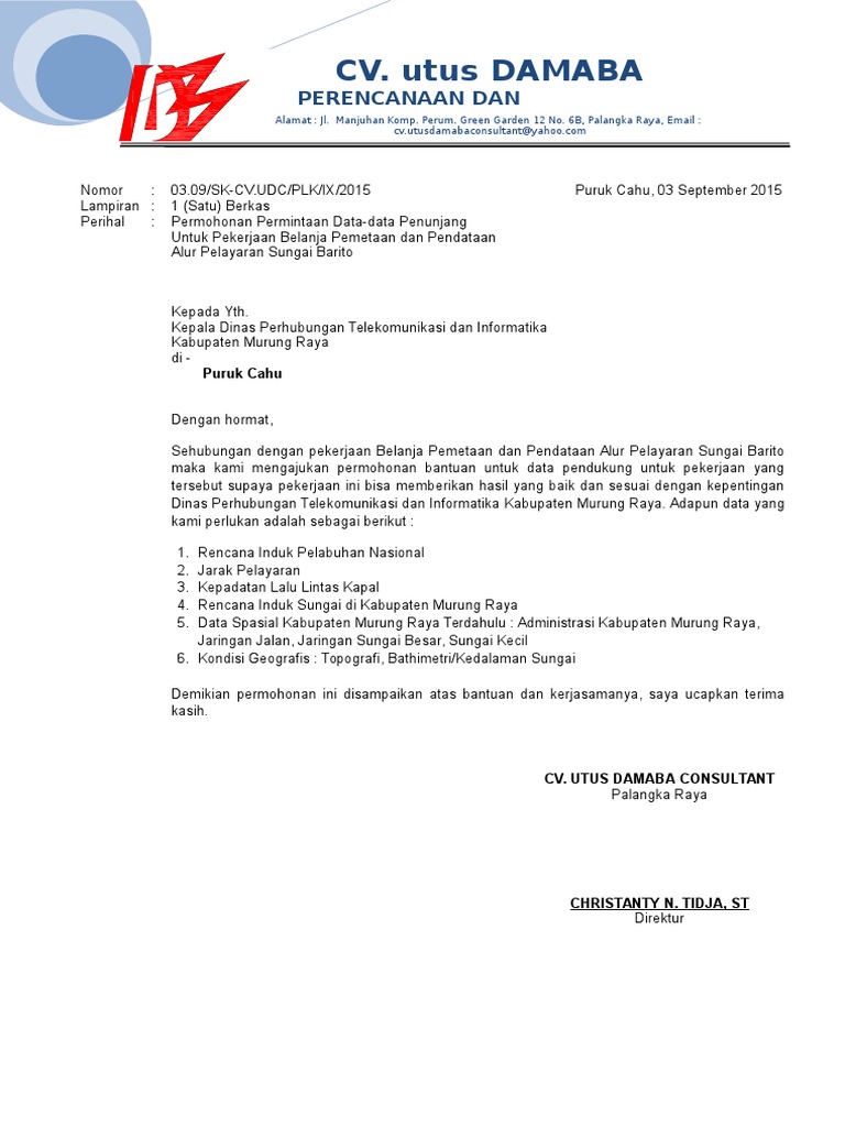 Contoh Surat Permohonan Data Untuk Skripsi. Berkas Permohonan Permintaan Data-data Penunjang Untuk Pekerjaan Belanja Pemetaan dan Pendataan Alur Pelayaran Sungai Barito Puruk Cahu 03 September 2015. Kepala Lembaga BKSDA DKI JAKARTA Dengan Hormat Melalui surat ini saya Nama.